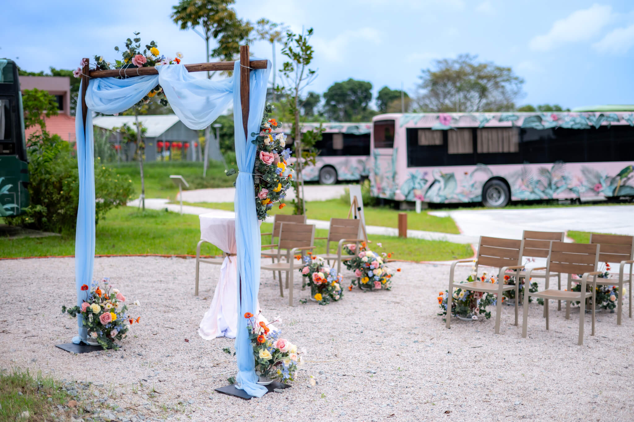 The Bus Collective offers an intimate outdoor venue surrounded by lush greenery, perfect for weddings and solemnisations.